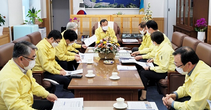 [½Ã»çÄÚ¸®¾ÆÀú³Î=Á¤Á¾¹Î ¼±ÀÓ±âÀÚ] â¿ø½ÃÀÇȸ(ÀÇÀå ÀÌÄ¡¿ì)´Â 5ÀÏ ÀÇÀå½Ç¿¡¼ â¿ø½Ã Äڷγª19 ´ëÀÀ »óȲÀ» È®ÀÎÇϰí Çù·Â ¹æ¾ÈÀ» ¸¶·ÃÇϰíÀÚ ±ä±Þ ÀÇÀå´Ü °£´ãȸ¸¦ °¡Á³´Ù.