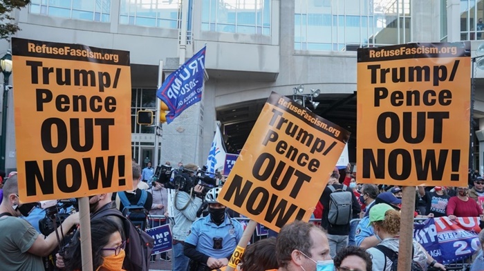 | ¹Ì±¹ ´ë¼±ÀÇ ÇÙ½É °æÇÕ ÁÖ(ñ¶)ÀÎ Ææ½Çº£À̴ϾÆÁÖ Çʶóµ¨ÇǾÆÀÇ 'Ææ½Çº£ÀÌ´Ï¾Æ ÄÁº¥¼Ç¼¾ÅÍ'¿¡ ¸¶·ÃµÈ °³Ç¥Àå ¹Û¿¡¼ 6ÀÏ(ÇöÁö½Ã°£) Á¶ ¹ÙÀÌµç ¹ÎÁÖ´ç ´ë¼±Èĺ¸ ÁöÁöÀÚµéÀÌ 'Æ®·³ÇÁ-Ææ½º ´çÀå ³ª°¡¶ó!'¶ó°í ¾²ÀÎ ÇÇÄÏÀ» µé°í ÀÖ´Ù. |