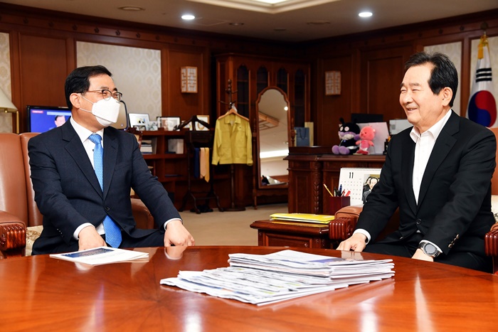 | Ç㼺¹« â¿ø½ÃÀåÀÌ 9ÀÏ ¼¿ï Á¤ºÎû»ç¸¦ ã¾Æ Á¤¼¼±Õ ±¹¹«ÃѸ®¿¡°Ô â¿øÁö¿ª Çö¾ÈÀ» ¼³¸íÇϸç ȯ´ãÇϰí ÀÖ´Ù. |