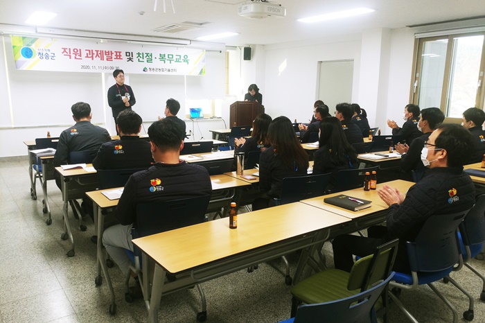 [½Ã»çÄÚ¸®¾ÆÀú³Î=±è¿¬ÇÐ ±âÀÚ] û¼Û±º³ó¾÷±â¼ú¼¾ÅÍ´Â 11ÀÏ Àü Á÷¿ø 30¿©¸íÀÌ Âü¼®ÇÑ °¡¿îµ¥ Á÷¿ø °úÁ¦¹ßÇ¥¿Í Ä£Àý‧º¹¹«±³À°À» ½Ç½ÃÇß´Ù.