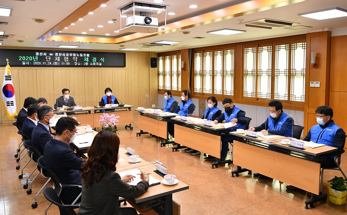 [½Ã»çÄÚ¸®¾ÆÀú³Î=À̵¿¿ì ±âÀÚ] °æ»ê½Ã(½ÃÀå ÃÖ¿µÁ¶)¿Í °æ»ê½Ã°ø¹«¿ø³ëµ¿Á¶ÇÕ(À§¿øÀå ¹Ú¹ÌÁ¤)Àº 24ÀÏ ¼ÒȸÀǽǿ¡¼ ³ë»ç ¾çÃø ±³¼·À§¿ø 14¸íÀÌ Âü¼®ÇÑ °¡¿îµ¥ ´Üü±³¼· ü°á½ÄÀ» °¡Á³´Ù.