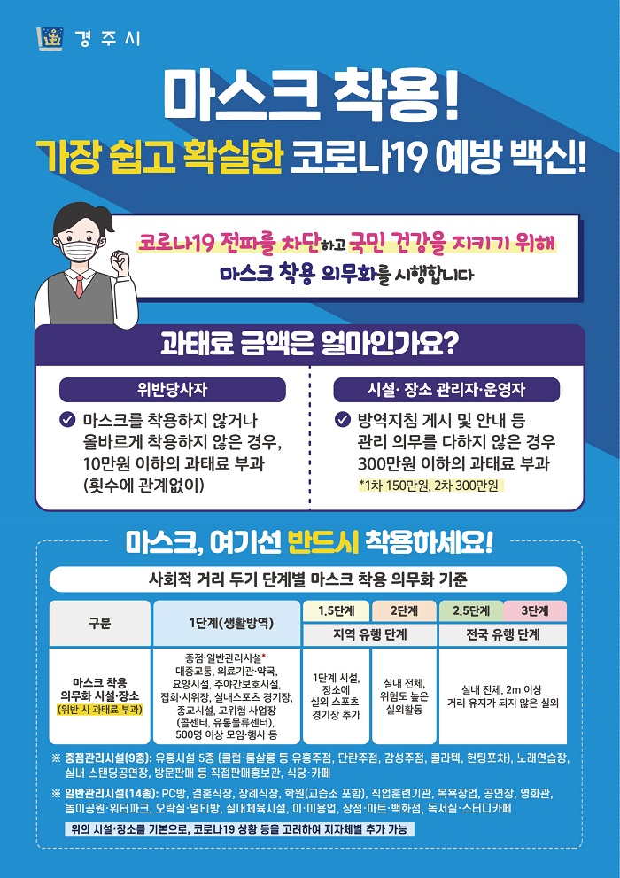 ¶ÇÇÑ, ‘¸¶½ºÅ© Âø¿ë Àǹ«È’ ¾È³» Æ÷½ºÅÍ 8,000ºÎ¸¦ ºÎÂøÇØ ½Ã¹Îµé¿¡°Ô »çȸÀû °Å¸® µÎ±â ´Ü°èº° ¸¶½ºÅ© Âø¿ë Àǹ«È ±âÁذú ¸¶½ºÅ© ¹ÌÂø¿ë½Ã À§¹Ý ´ç»çÀÚ¿Í ½Ã¼³°ü¸®ÀÚ¿¡°Ô ºÎ°úµÇ´Â °úÅÂ·á µîÀ» ¾È³»·È«º¸Çß´Ù.