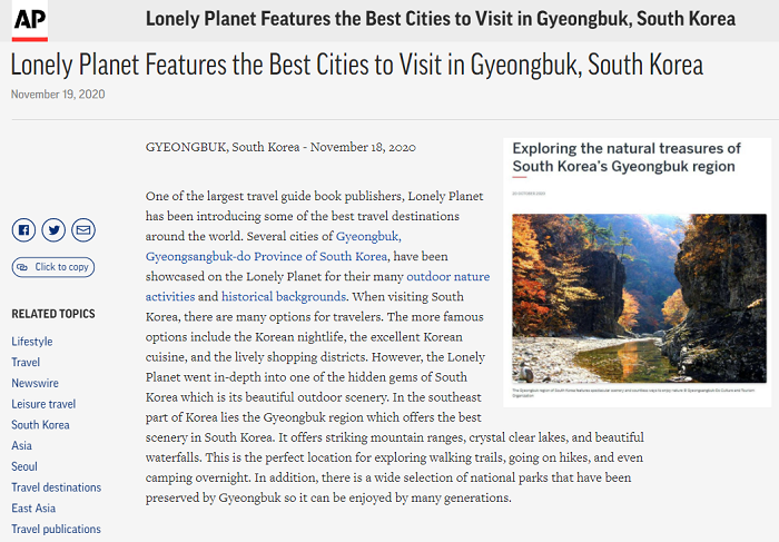 °ø»ç¿¡ µû¸£¸é, Áö³ 19ÀÏ ¼¼°è ÃÖ´ë ¾ð·ÐÅë½Å»çÀÎ ¹Ì±¹ AP¿¡ °æºÏ ¿©ÇàÁö°¡ ¼Ò°³µÇ¾ú´Ù. °æºÏÀº Áö³ 10¿ù ¼¼°èÀûÀÎ ¿©Çà ¸ÅüÀÎ ‘·Ð¸®Ç÷¡´Ö’¿¡ ´º³ë¸Ö ½Ã´ë ±Û·Î¹ú ¿©ÇàÁö·Î ¼Ò°³µÈ ÈÄ, ¿¬ÀÌÀº ¿Ü½Å º¸µµ·Î ±Û·Î¹ú ½ÃÀå¿¡¼ °æºÏ°ü±¤ÀÇ ¸Å·Â°ú ÀáÀç·ÂÀ» È®ÀÎÇß´Ù´Â Æò°¡´Ù.