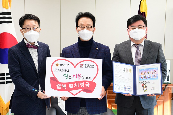 [½Ã»çÄÚ¸®¾ÆÀú³Î=Á¤Á¾¹Î ¼±ÀÓ±âÀÚ] °æ³²µµÀÇȸ ±èÇÏ¿ë ÀÇÀåÀº 30ÀÏ Áý¹«½Ç¿¡¼ 2020³â Å©¸®½º¸¶½º ¾Á ÁõÁ¤½ÄÀ» °®°í, ¹Ú¾çµ¿ ´ëÇѰáÇÙÇùȸ ¿ï»ê·°æ³² ÁöºÎÀå¿¡°Ô °áÇÙÅðÄ¡ ¼º±ÝÀ» Àü´ÞÇß´Ù.
