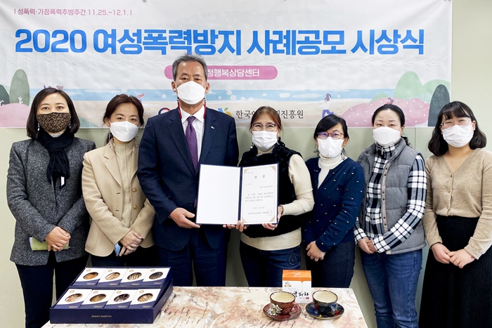 | ÇÕõ°¡Á¤Çູ»ó´ã¼¾ÅͰ¡ ¿©¼º°¡Á·ºÎ¿Í Çѱ¹¿©¼ºÀαÇÁøÈï¿øÀÌ ÁÖ°üÇÑ '2020³â ¿©¼ºÆø·Â¹æÁö »ç·Ê°ø¸ðÀü'¿¡¼ ¿ì¼ö»óÀ» ¼ö»óÇß´Ù. |