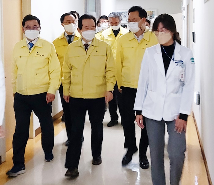 | Á¤¼¼±Õ ÃѸ®°¡ 4ÀÏ Äڷγª19 Àü´ãº´¿øÀÎ ¸¶»êÀÇ·á¿øÀ» ¹æ¹®, ÇöȲÀ» »ìÇÇ°í º´¿ø ±Ù¹«ÀÚµéÀ» °Ý·ÁÇß´Ù. |