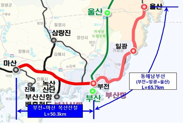 ºÎ»ê(ºÎÀü)~â¿ø(¸¶»ê) º¹¼±Àüö(ÀÌÇÏ ‘ºÎÀü~¸¶»ê’)Àº 2014³â 6¿ù Âø°øÇØ Ã¢¿ø~±èÇØ~ºÎ»ê°£ 9°³¿ª 50.3§°¸¦ Á÷Á¢ ¿¬°áÇÏ´Â 1Á¶ 5,766¾ï¿ø ±Ô¸ðÀÇ ½Å±Ô ±¹°¡Ã¶µµ »ç¾÷À¸·Î 2020³â 11¿ù ÇöÀç 98%ÀÇ °øÁ¤À²À» º¸À̰í ÀÖ´Ù.
