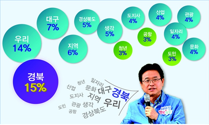 ÀÌ µµÁö»ç´Â ÃëÀÓ ÀÌÈÄ 2³â µ¿¾È ‘°æºÏ’À̶ó´Â ´Ü¾î¸¦ 1,973ȸ, ‘¿ì¸®’¸¦ 1,853ȸ, ‘´ë±¸’¸¦ 1,002ȸ »ç¿ëÇß´Ù. »ç¿ëºóµµ ¼ö »óÀ§ 20À§±îÁö Àüü´Ü¾î 1¸¸3,487°Ç Áß °¢°¢ 15%, 14%, 7%¿¡ ÇØ´çÇÏ´Â ¼öÄ¡´Ù.
