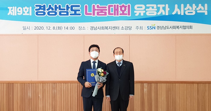| BNK°æ³²ÀºÇà ¹ÚÇü¿í ´ë¸®(»çÁø ¿ÞÂÊ)°¡ 8ÀÏ °æ³²»çȸº¹Áö¼¾ÅÍ ´ë°´ç¿¡¼ ¿¸° Á¦9ȸ °æ»ó³²µµ ³ª´®´ëȸ¿¡ Âü¼®ÇØ °æ»ó³²µµ»çȸº¹ÁöÇùÀÇȸ ¹Ú¼º¿í ȸÀåÀ¸·ÎºÎÅÍ ‘°æ³²µµÁö»ç ǥâ’À» ¹Þ°í ÀÖ´Ù. |