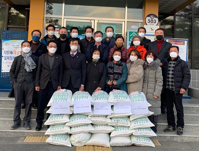 [½Ã»çÄÚ¸®¾ÆÀú³Î=±è¿¬ÇÐ ±âÀÚ] ¿µ¾ç±º ¼öºñ¸éÁÖ¹ÎÀÚÄ¡À§¿øÈ¸(À§¿øÀå ¹è¿øÀº) À§¿øµéÀº ´Ù°¡¿À´Â ¿¬¸»À» ¾ÕµÎ°í Áö³ 9ÀÏ °ü³» °æ·Î´ç 20°³¼Ò¸¦ ¹æ¹®ÇØ »ç¶ûÀÇ ½Ò 25Æ÷´ë¸¦(1Æ÷´ë 20kg) Àü´ÞÇß´Ù.