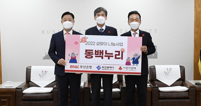 | BNKºÎ»êÀºÇàÀÌ 18ÀÏ ¿ÀÈÄ, ºÎ»ê½Ãû¿¡¼ ‘¼³¸ÂÀÌ µ¿¹é´©¸® ³ª´®»ç¾÷’ Àü´Þ½ÄÀ» ½Ç½ÃÇϰí Áö¿ª ¼Ò¿Ü°èÃþ¿¡°Ô 4¾ï5000¸¸¿ø »ó´çÀÇ ÀüÅë½ÃÀå ¿Â´©¸®»óǰ±ÇÀ» Áö¿øÇÑ´Ù°í ¹àÇû´Ù.(»çÁø ¿ÞÂʺÎÅÍ ºÎ»êÀºÇà ¾È°¨Âù ÀºÇàÀå, ºÎ»ê½Ã À̺´Áø ÇàÁ¤ºÎ½ÃÀå, ºÎ»ê»çȸº¹Áö°øµ¿¸ð±Ýȸ ÃÖ±Ý½Ä È¸Àå) |