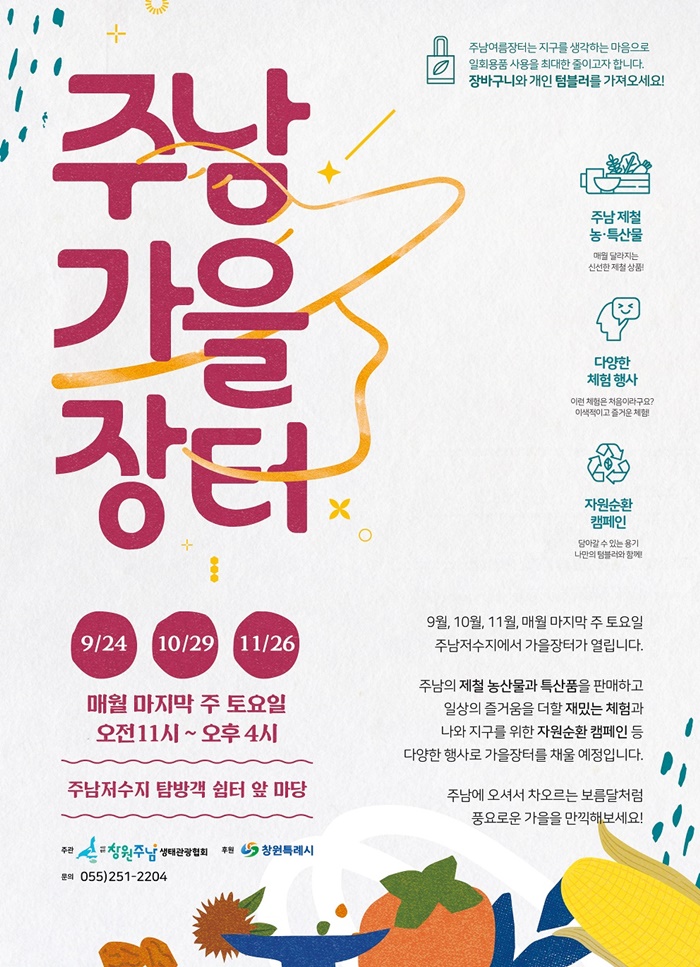 ¿À´Â 24ÀÏ ‘ÁÖ³² °¡À» ÀåÅÍ’´Â ¿ÀÀü 11½ÃºÎÅÍ ¿ÀÈÄ 4½Ã±îÁö ÁÖ³²Àú¼öÁö »ýÅÂÇнÀ°ü ¿· °øÅÍ¿¡¼ °³ÃֵǸç 10¿ù 29ÀÏ, 11¿ù 26ÀÏ¿¡µµ °³ÃÖµÉ ¿¹Á¤ÀÌ´Ù.